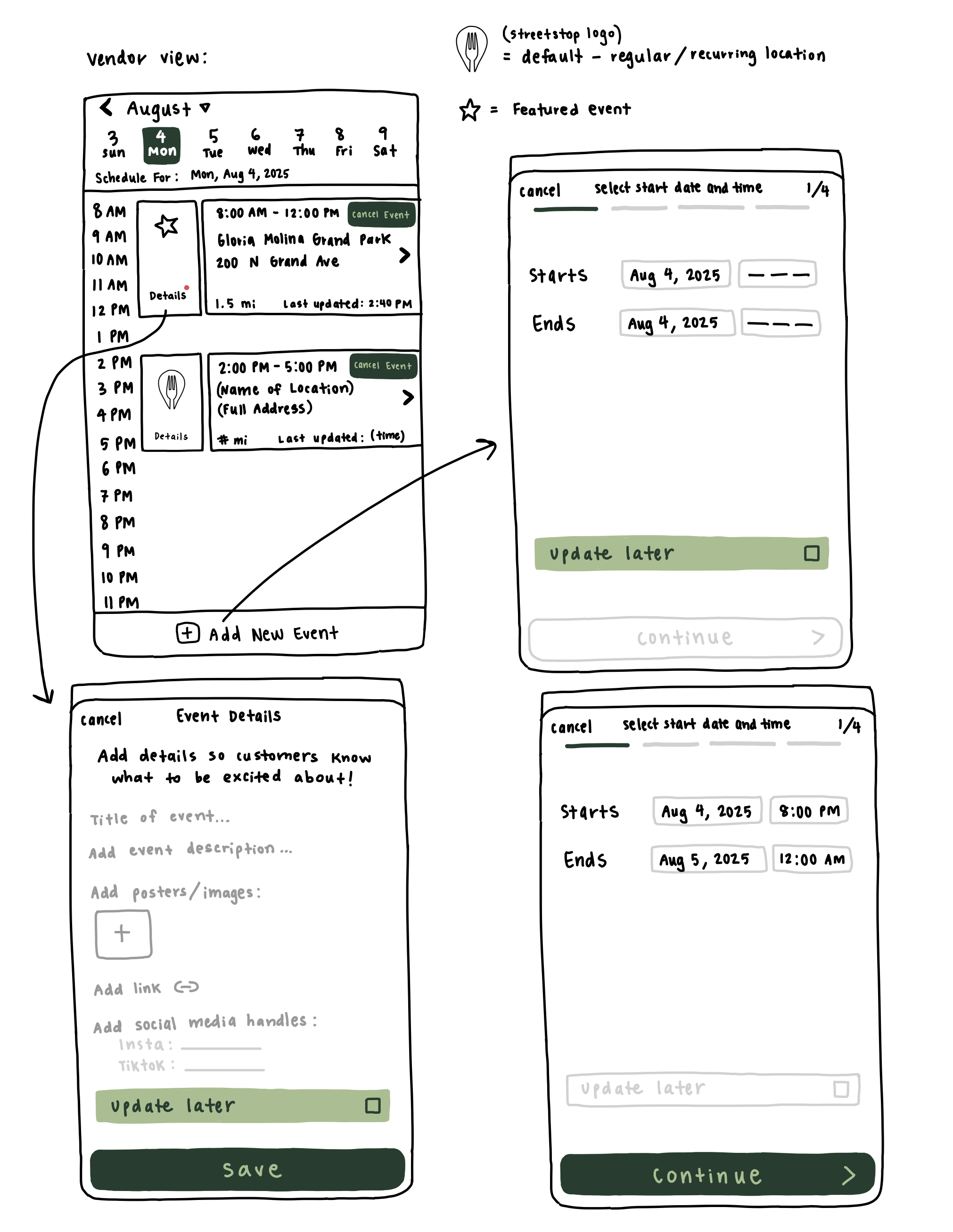 To define the structure of the vendor-facing schedule tool, I created a user flow that maps out the essential interactions vendors need to manage their popups. The flow prioritizes simplicity, convenience, and real-time updates. Vendors can easily add new popups, edit or cancel existing ones, and publish changes instantly—significantly reducing the manual work previously required from the Streetstop team.