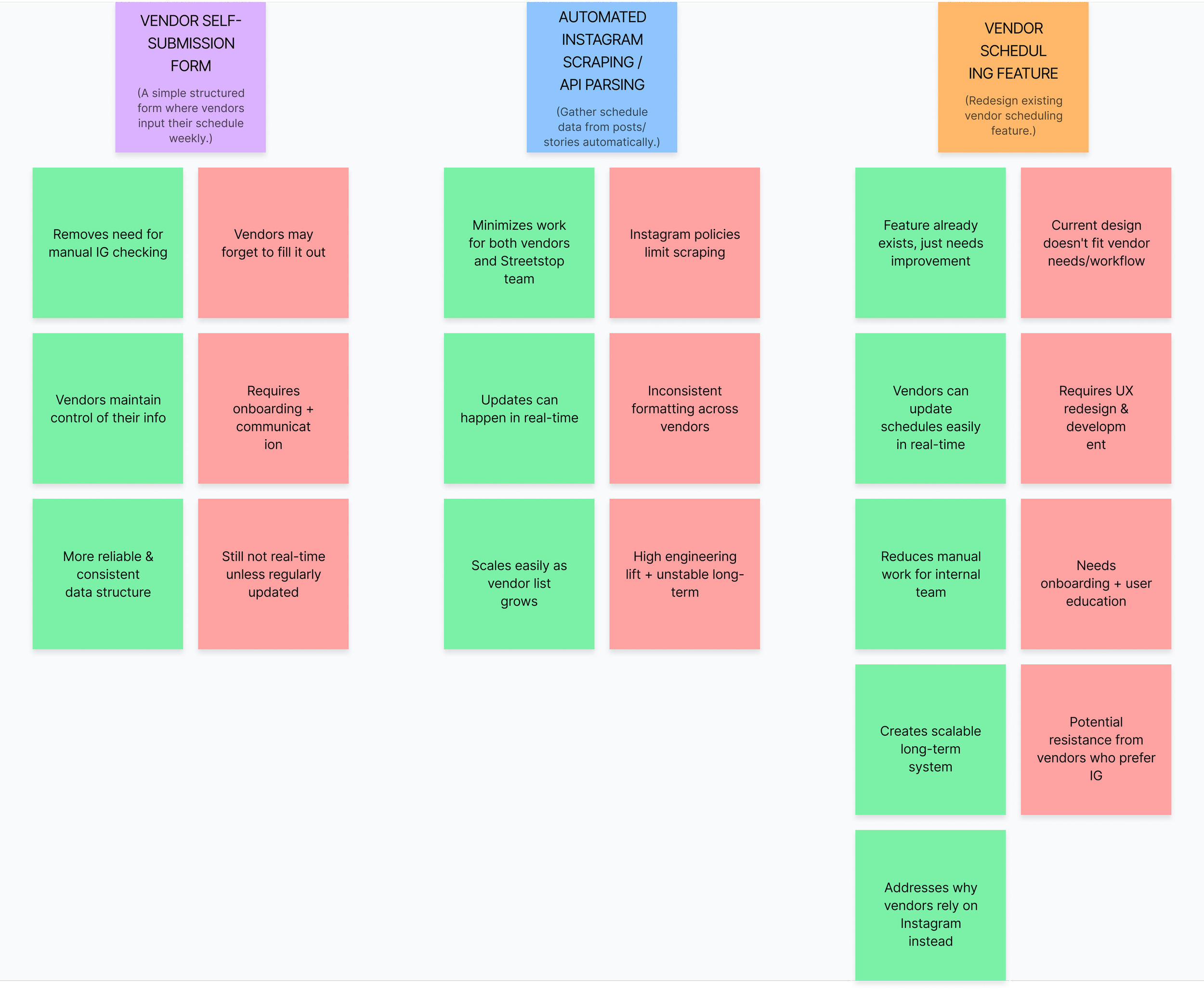 Using the user insights gathered from interviews, the problem statement, and observations of Streetstop’s internal workflow, we brainstormed several possible directions to address the inefficiencies in how vendor schedules were collected and updated.